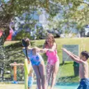 Summer fun at Ōtaki Pool splashpad with the slippery slope in the background.